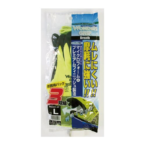 - 品名:手袋 WG ブレス 3双組 蛍光イエロー Lサイズ、素材:(手袋繊維)ポリエステル、(コーティング部分)ニトリルゴム水性PU