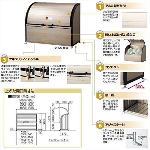 ●1.景観にやさしい印象のアールデザイン。丸みのあるフォルムで景観にやさしい印象を与えるおしゃれな外観。2.優れた耐久性本体をアルミ材、金具とビスをステンレス製にすることで高耐久性を実現。3. 軽い上ぶた ・ 広い投入口ガススプリングを採用し、上ぶたの開閉が簡単で安全です。また開口部が大きく開き、ゴミの投入及び収集が容易にできます。4.コンパクトサイズ狭い場所にもすっきり納まるように、奥行きを600mmとしています。