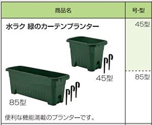 ベランダなどの省スペースに置ける底面給水機能付き小型プランターです。たっぷり水分補給が必要な緑のカーテンに最適です。ネットはついていません。プランターサイズ:幅45cm、奥行き29cm、高さ31.5cm ネットのサイズ:幅60cm、高さ270cm土の容量:17リットル水の容量:2.5リットル色:グリーン