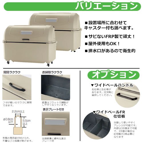ワイドペールFR 1500 94482-0 キャスター無しゴミステーション、物置として飲食店や店舗、公共施設、ゴミ収集所、病院、会社などで幅広く使えます。送料 無料※沖縄・北海道・離島は別途費用が必要です。※アパート・マンション等1階での商品渡しとなります。※大型商品につき荷降ろしの際にお客様にお手伝いをお願いする場合がございます。予めご了承ください。容量 1500 リットル仕様排水口付アイボルト付表示プレート付カギ穴付 (カギは別売品)サイズ 本体:W180×D92×H129.5cm投入口:62×140cm材質 FRP、他重量 49.3kgセット内容 ■ワイドペールFR 1500 94482-0 キャスター無し備考・注意 ※こちらの商品には、キャスターはついていません。※南京錠は、別売品です。※製品仕様、梱包仕様、色、及び価格は予告なく変更することがあります。※画像の色調は実物とは異なることがあります。