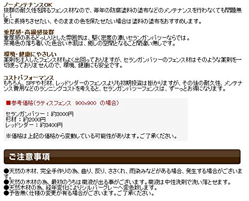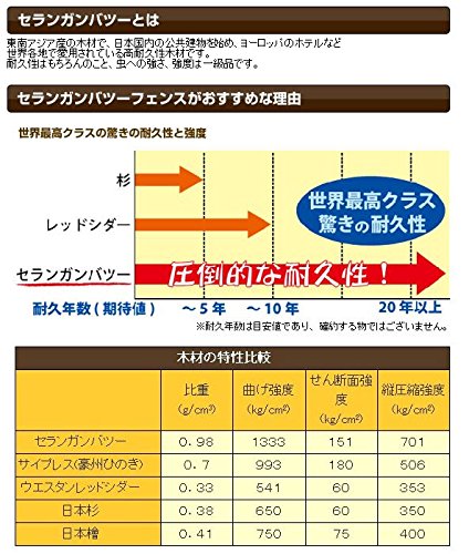 公共事業など実績多数の高級木材を使用 他の製品と比べ数倍以上の圧倒的な耐久性 高耐久性ラティスフェンス セランガンバツーとは東南アジア産の木材で、日本国内の公共建物を始め、ヨーロッパのホテルなど世界各地で愛用されている高耐久性木材です。 耐久性はもちろんのこと、虫への強さ、強度は一級品です。
