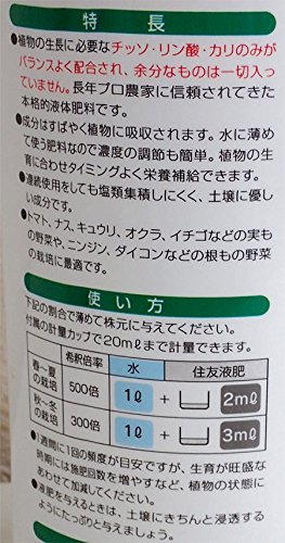 - ご使用方法: 野菜の葉がややしんなりとしてきましたら、水を与えて下さい。長雨の時には野菜に雨よけをし、水分量をできるだけコントロールして下さい。液肥は週に1度を目安とし、500倍に薄め、水やりの際に底からでるくらいたっぷりと与えて下さい。夏場の高温時には、植物が葉の蒸散を防ぐ為に気孔を閉じておりますので、朝・夕の涼しい時に水やり(施肥)をして下さい。また、冬場は土が凍って根を傷めることを防ぐ為、日中の暖かい時間帯に与えて下さい。