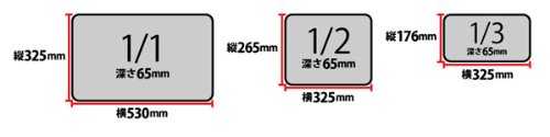 【ホテルパン収納枚数】20段(深さ65mm) / 1/3(325mm×176mm):横3枚×20段=60枚 / 1/2(325mm×265mm):横2枚×20段=40枚 / 1/1(530mm×325mm):縦1枚×20段=20枚