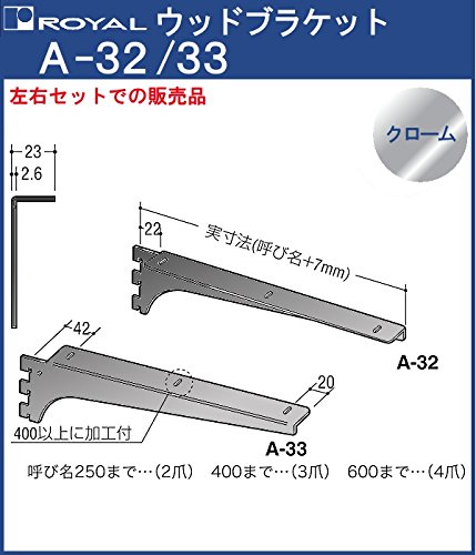 ロイヤル ウッドブラケット 木棚板専用棚受け クロームメッキ A-32/33 呼び名:200 2ツ爪タイプ 「左右1セットでの販売品」