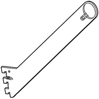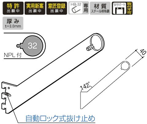 スリット穴掛け式棚等設置システムのハンガー横掛け陳列用丸パイプ設置用腕金具φ32用