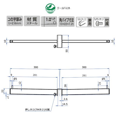 材質:スチール(パイプ規格10×22×1.2t、コの字部2.6t、ダボサイズ5φ×12)(先端フタ:ABS樹脂)