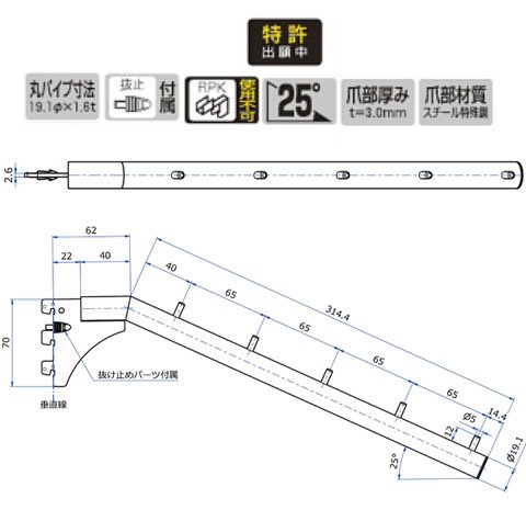 材質:スチール(パイプ規格19.1φ×1.6t、爪部鋼板厚2.6t、ダボサイズ5φ×12)(先端フタ:ABS樹脂)