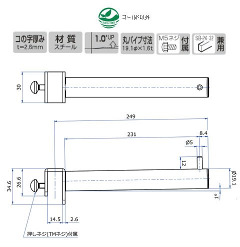材質:スチール(パイプ規格19.1φ×1.6t、コの字部2.6t、ダボサイズ5φ×12)/先端フタ:ABS樹脂