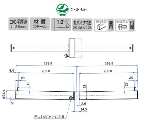 材質:スチール(パイプ規格25.4φ×1.2t、コの字部2.6t、ダボサイズ5φ×12)/先端フタ:ABS樹脂