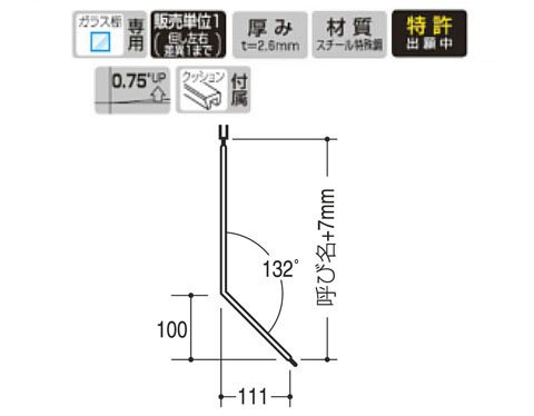 スリット穴掛け式棚等設置システムの、ガラス棚専用腕金具(先端前ズレ防止構造付き、ブラケット先端部が棚板の内側に入る曲げ加工付き)