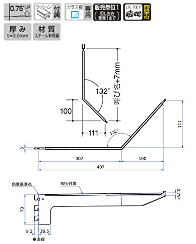 スリット穴掛け式棚等設置システムの、ガラス棚専用腕金具(先端前ズレ防止構造付き、ブラケット先端部が棚板の内側に入る曲げ加工付き)