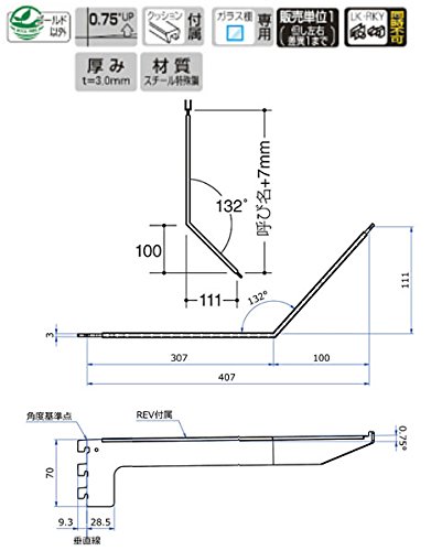 スリット穴掛け式棚等設置システムの、ガラス棚専用腕金具(先端前ズレ防止構造付き、ブラケット先端部が棚板の内側に入る曲げ加工付き)