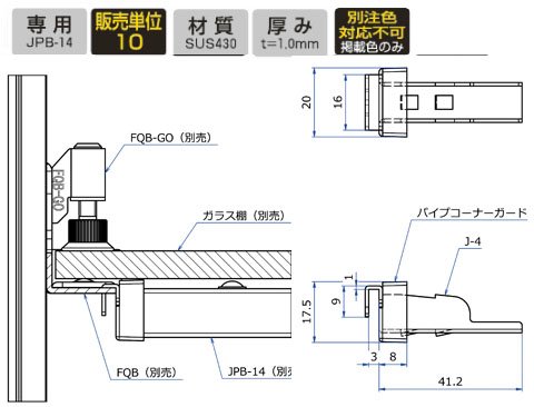 クイックブラケット(FQB・RQB)用の、JPバー14(JPB-14)固定専用Jホルダー(パイプ断面が陳列商品と接触しない様軟質樹脂製カバー付/フラット位置用)