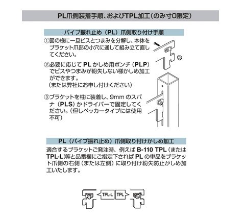 パイプ用として先端に取り付ける場合(PL加工)と、一部巾広の基礎支柱へ装着した場合、より振れ止め効果を上げるために爪側に取りつける場合(TPL加工)の2通りの用途あり