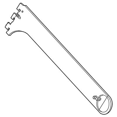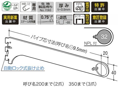 スリット穴掛け式棚等設置システムのハンガー横掛け陳列用丸パイプ設置用腕金具32φ用