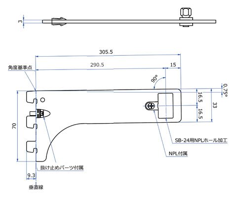 スリット穴掛け式棚等設置システムの、Sバー24(SB-24)装着用腕金具(Sバー装着式フェイスパーツのねじれ荷重対応)