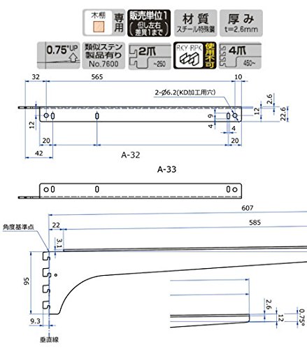 スリット穴掛け式棚等設置システムの、木棚専用腕金具