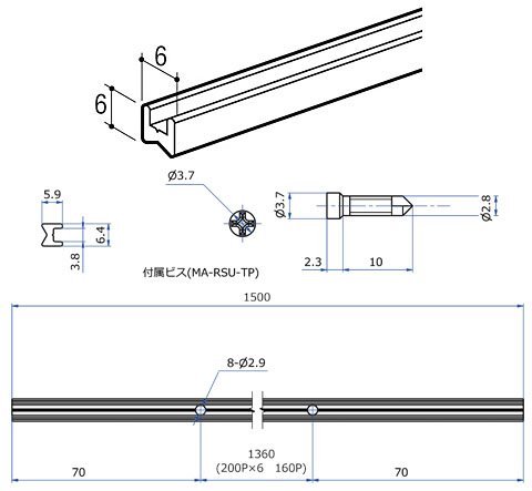 ビス穴ピッチ200mm(但しサイズ900・1500は最後160mmピッチ、1200・1800は最後60mmピッチ、共に端から70mm位置より加工スタート)