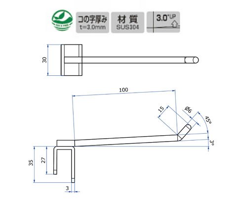 ロイヤル ステンレスロッドフック6径 呼名100 ステンレスヘアーライン SUS-6R
