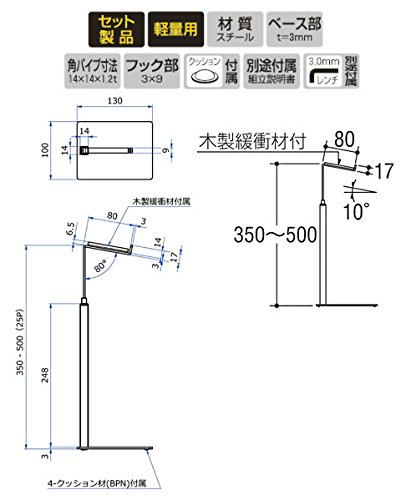 材質:スチール(ベース100×130×3.0t クッション付、パイプ規格14×14×1.2t、首部3×9フラットバー、シューズ陳列プレート50×100×2t木製ストラップ受け付き)