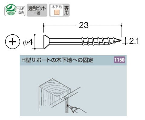 Hサポート(HSF-012)を木下地に固定するための小頭タッピングビスで、カラーバリエーションが豊富である事が特徴(軽鉄下地材には使用不可注意)