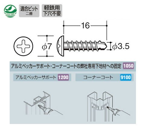 アルミペッカーサポート、およびコーナーコート系製品を弊社製厚肉スタッドに固定するための先端ドリル付き一般規格タッピングビス