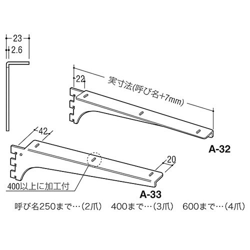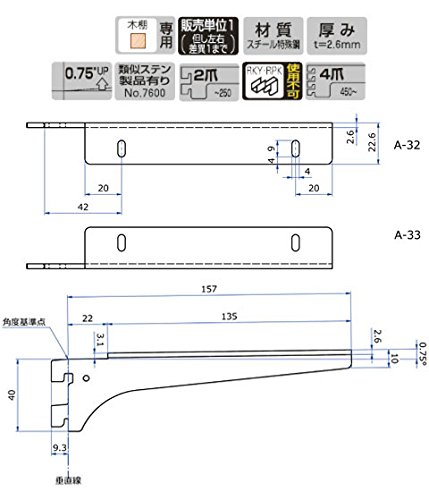 スリット穴掛け式棚等設置システムの、木棚専用腕金具