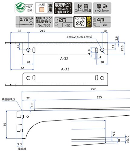 スリット穴掛け式棚等設置システムの、木棚専用腕金具