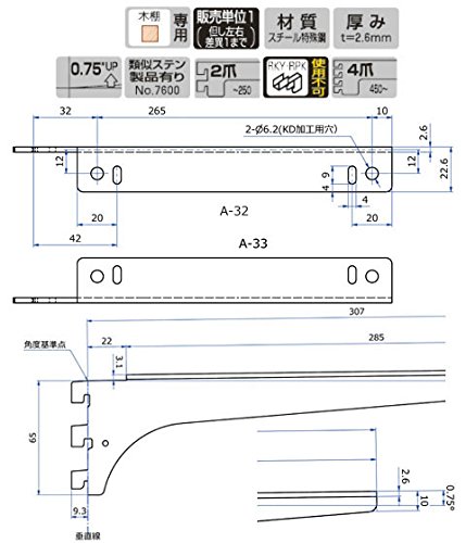 スリット穴掛け式棚等設置システムの、木棚専用腕金具