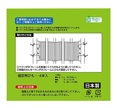 ●紫外線約96%カット(岡山県工業技術センターにて測定)。●固定用ひも4本付き。●日本製で耐久性にも優れています。【注意事項】●ベランダのフレームに、前後にくぐらせるように通して設置してください。●台風や強風など落下する恐れのある時は、取り外してください。●ぶら下がったり、引っ張ったりしないで下さい。