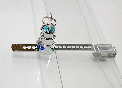 お店のショーウィンドウなどでよく見かけるガラス用の錠です。