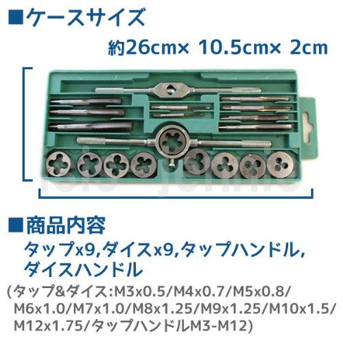 - 商品内容:タップ×9、ダイス×9、タップハンドル、ダイスハンドル