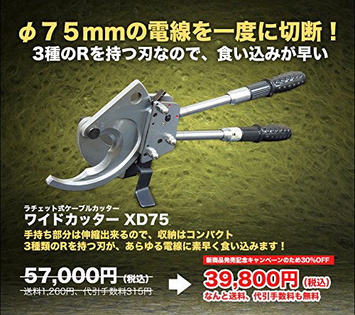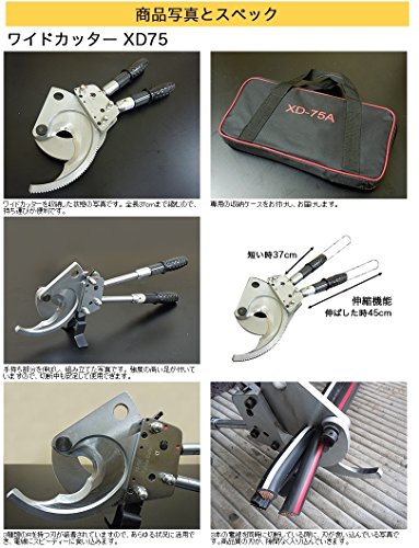 ワイドカッターXD75は、最大φ75mmまでの電線を一度に切断することが出来るラチェット式ケーブルカッターです。 3種類のRを持つ刃により、素早いカットが可能です。 全長37cmまで縮むので、持ち運びが便利です。 専用の収納ケースをお付けし、お届けします。強度の高い足が付いていますので、切断中も安定して使用できます。3種類のRを持つ刃が装着されていますので、あらゆる状況に活用でき、電線にスピーディーに食い込みます。