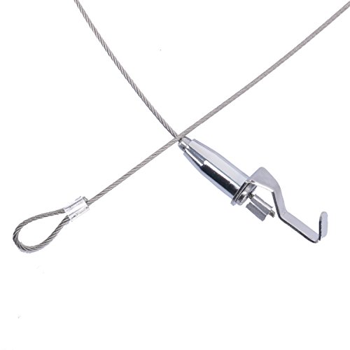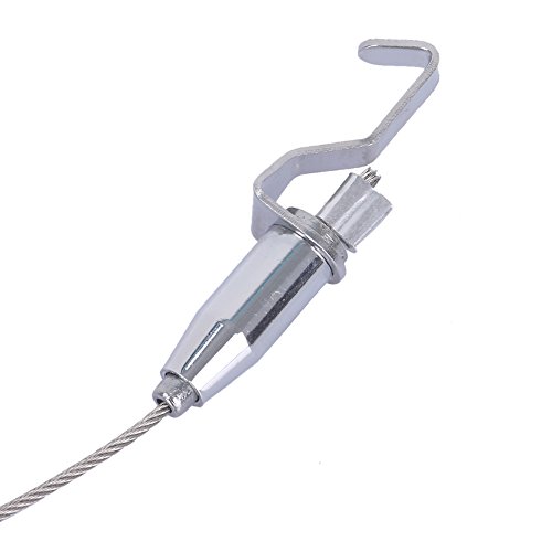 - フック形状の自在金具とワイヤーがセットになった吊下げ金具です。掲示物の位置はフックのピンを押し込むだけで、お好みの高さへ無段階調節できます。