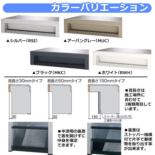 郵便ポスト 埋め込み式ポスト SOV1型-150-MKC ブラック 2ブロックタイプ 首長さ150mmタイプスタンダードでリーズナブルな埋込みタイプのポスト!送料 無料※北海道、沖縄、離島は別途料金が必要となります。サイズ 本体:W400×D410×H390mm 首長さ150mmカラー ・シルバー(RSI) ・アーバングレー(MUC) ・ブラック(MKC) ・ホワイト(RWH)仕様 埋め込み式ポスト(前入れ後取出し)/南京錠取付可能※南京錠は別途ご用意ください。材質 本体:ガルバリウム鋼板+塗装 口金部:アルミ鋳物 裏蓋:ポリカーボネートセット内容 ■SOV-N150W型MKC ブラック 2ブロックタイプ 首長さ150mmタイプ備考・注意 ※配送には実働約3日~5日程度お時間がかかる場合があります。※口金下部にモルタル化粧仕上げが必要です。※イメージ画像はイメージサンプルとして販売内容以外の商品があります。必ず内容を確認ください。※イメージ画像は使用するモニターやブラウザにより色が違って見える場合があります。