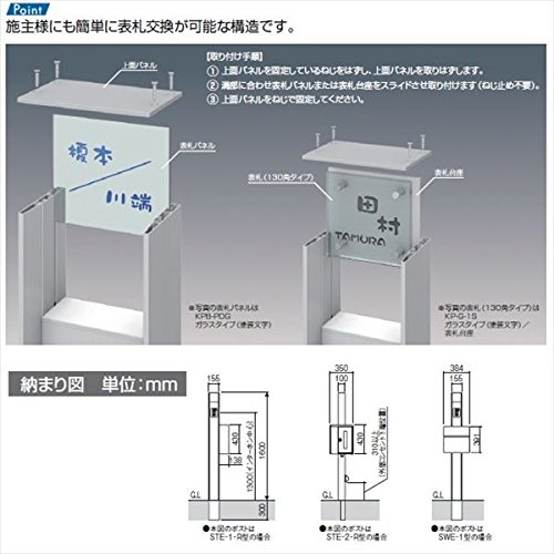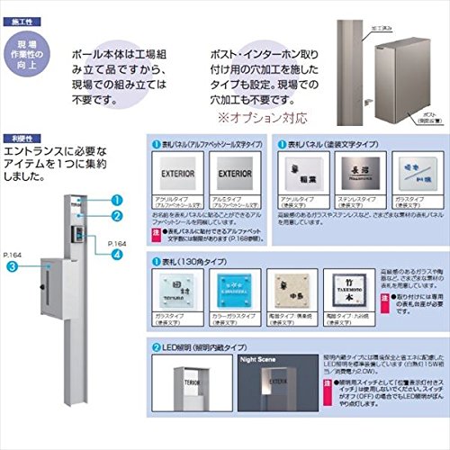 ●これからの外構ニーズに応え、デザイン性のみならず施工性においてもスマートさにこだわった機能門柱です。施主様にも簡単に表札の交換が可能な構造と、ポール本体は工場組立品のため、現場での対応を極力少なく出来ます。さらにオプションで、ポスト・インターホン取付用の穴加工を施したタイプに変更することも可能です。※SWE型ポストには対応しておりません。