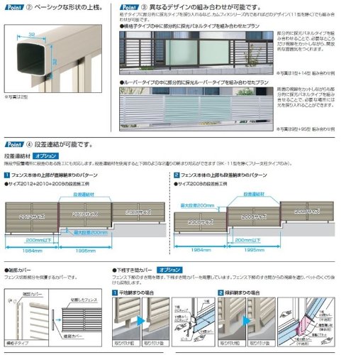●三協アルミのベーシックなアルミフェンスです。主な特徴として、豊富なデザインバリエーション、支柱ピッチは全サイズ1975mm、異なるデザインの組合せが可能、段差連結が可能、などがあげられます。