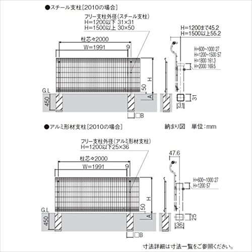 ●アルミ形材支柱はH=1200までの設定となっています。それ以上のサイズの場合は、スチール支柱を使用してください。