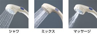 ■そのまま取り付けOK!・・・SAN-EI INAX MYM KAKUDAI TBC YUKO・ミズタニの一部製品 ■付属のアダプターでOK! TOTO(細) TOTO(太) KVK ・シャワー・マッサージ切替 ・ストップ機能付 ・他メーカーへのシャワーアダプターセット3付 ■シャワーホースの長さ1.6m ■材質シャワーヘッド:ABS樹脂、シャワーホース:塩化ビニル樹脂 注)逆止弁のない混合栓に使用する場合は、PV822S逆止アダプターを取付けてください。最高使用温度は60℃です。