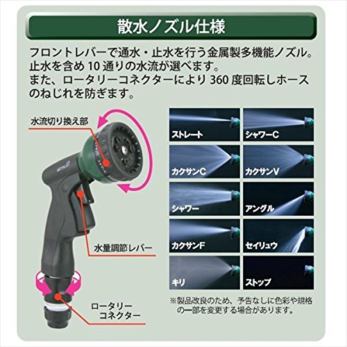 ●高級アルミ合金フレームを使用し、塗装は外部環境に強いアクリル焼付けを採用。散水ノズルは金属製で割れづらく、散水中でも冷たさを感じない設計です。ホースは内径12ミリを採用。