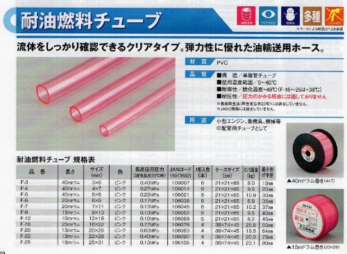 ●弾力性、柔軟性に富み、従来の硬い耐油チューブのイメージを一新しました。●従来の耐油チューブに比べ長期使用できる特殊耐油チューブです。エンジンや狭小部への配管などに最適です。●従来の燃料チューブにくらべ、硬くなりにくいよう特殊配合により、物性の向上がはかられています。●柔らかく、折れにくいので曲げ半径が小さく、狭小部の取り付け・配管に最適です。●全長(m):10●内径×外径(mm):12×16●使用圧力(MPa):0.1●脆化温度:-40℃●使用温度範囲:-10~60℃●適用流体:燃料(ガソリン・軽油など