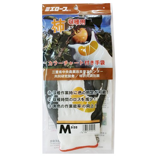 ●【用途】カラーチャート付収穫用手袋(柿用)。【機能・特徴】親指股に測色用カラーチャートを表示することでカラーチャート板を出し入れする手間が省け、収穫時間のロスが減少します。測色の作業能率が向上します。農林水産省果樹試験場基準カラーチャートの柿用カラーチャート番号3・3.5・4を参考に作成しています。