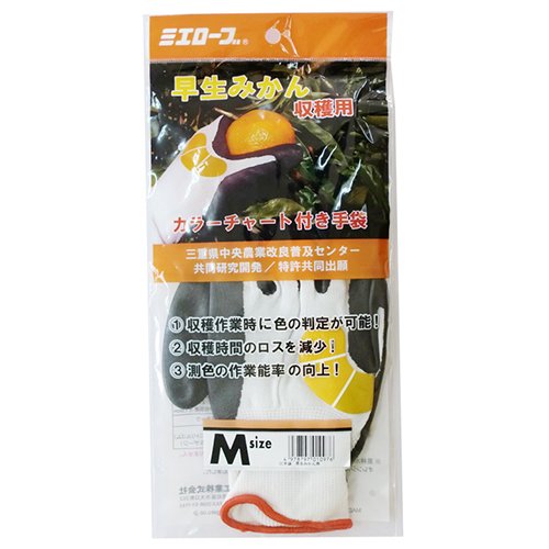 ●【用途】カラーチャート付収穫用手袋(早生みかん用)。【機能・特徴】親指股に測色用カラーチャートを表示することでカラーチャート板を出し入れする手間が省け、収穫時間のロスが減少します。測色の作業能率が向上します。農林水産省果樹試験場基準カラーチャートのオレンジ用カラーチャート番号3・4・5を参考に作成しています。