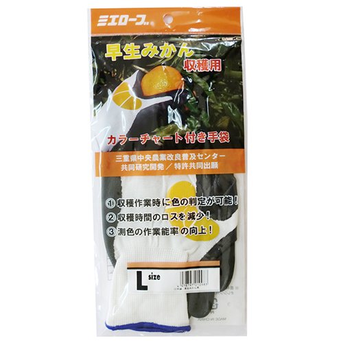 ●【用途】カラーチャート付収穫用手袋(早生みかん用)。【機能・特徴】親指股に測色用カラーチャートを表示することでカラーチャート板を出し入れする手間が省け、収穫時間のロスが減少します。測色の作業能率が向上します。農林水産省果樹試験場基準カラーチャートのオレンジ用カラーチャート番号3・4・5を参考に作成しています。