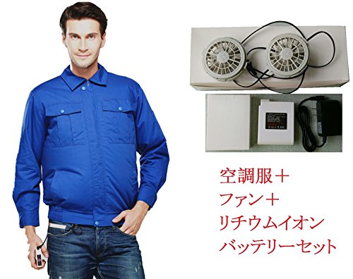 (熱中症対策) 綿100% 高所作業用 長袖 空調服 バッテリー・ファンセット エアコン服 ブルー サイズ170