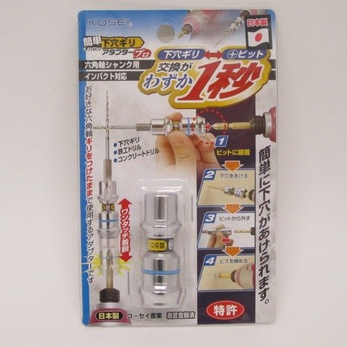 下穴ギリとドライバービットの交換がワンタッチで出来るアダプターです。【特長】・ドライバービットに装着して、下穴あけ作業とネジ締め作業が素早く出来ます。・ワンタッチ着脱で簡単に行えます。・六角軸6.35%のドリルビット専用です。・インパクト対応のプロ仕様です。