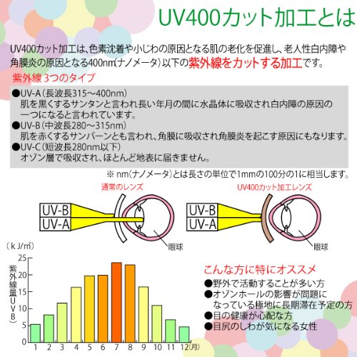 ●UV400仕様で、有害な紫外線をカットするレンズ加工が施されている。オゾン層の破壊によって日本でも紫外線が問題視され始めている。外に出て遊ぶことが多い子どもにとって紫外線対策は重要
