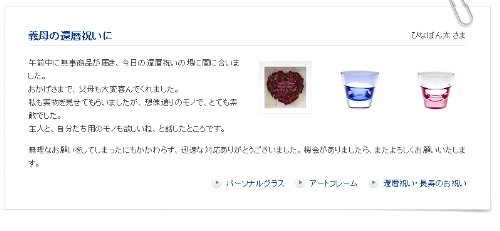 - 【お客様の声】 評価5.00 寿退社される方へのプレゼント 記念として残る物をお渡ししたいなと考えていた所、とてもステキな商品に出会いました。 当日お渡しして、皆の前でお披露目しましたが凄くステキだったし、何より本人が喜んでました。打ち合わせもしなかったのに、別の者からはワイングラスを進呈されていたので尚一層喜ばれていたと思います。また利用したいです(20代男性) 評価5.00 綺麗に彫れていました。 退職祝いに使いましたが 大変よろこんでいただけました。(20代女性) 評価5.00 プレゼント 職場のオーナーの誕生日にプレゼントしました。 何をあげていいのかわからなかったし、お酒好きだからな~という感じで注文したのですが、すごく喜んでいただけました。メッセージが入ってるなんて思わないでしょうから~♪(20代女性) 評価5.00 還暦祝いとして 伯母への還暦祝いとして贈ったところ、とても感動して喜んでもらえました。伯母から完成品の写真を送ってもらったところ、メッセージも希望通り入っていて完璧でした!!また機会があったらお願いしたいと思います。