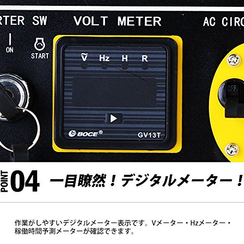 - 発電機 周波数 50Hz/60Hz電源 100V×2 / 200V / DC最大出力 3.5KVA(50Hz) / 3.5KVA(60Hz)定格出力 3.1KVA(50Hz) / 3.1KVA(60Hz)電圧調整 AVR力率 1.0騒音値 約65dB