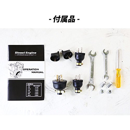 - 最大出力:6.0kw 定格出力:5.5kw 燃料の種類:軽油 燃料タンク容量:17L 始動方式:セルスターター・リコイルスターター両装備 生産国:中国 説明書:あり(英語)